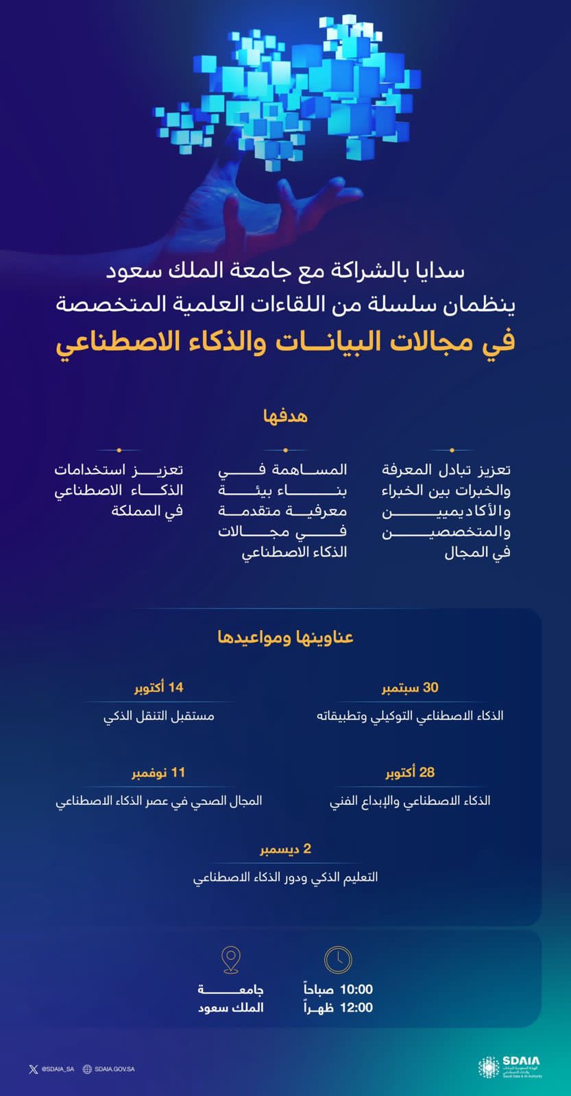 يدعوكم مكتب الذكاء الاصطناعي بالتعاون مع الهيئة السعودية للبيانات والذكاء الاصطناعي (سدايا) لحضور مجموعة من اللقاءات العلمية المتخصصة في مجالات البيانات و الذكاء الاصطناعي .